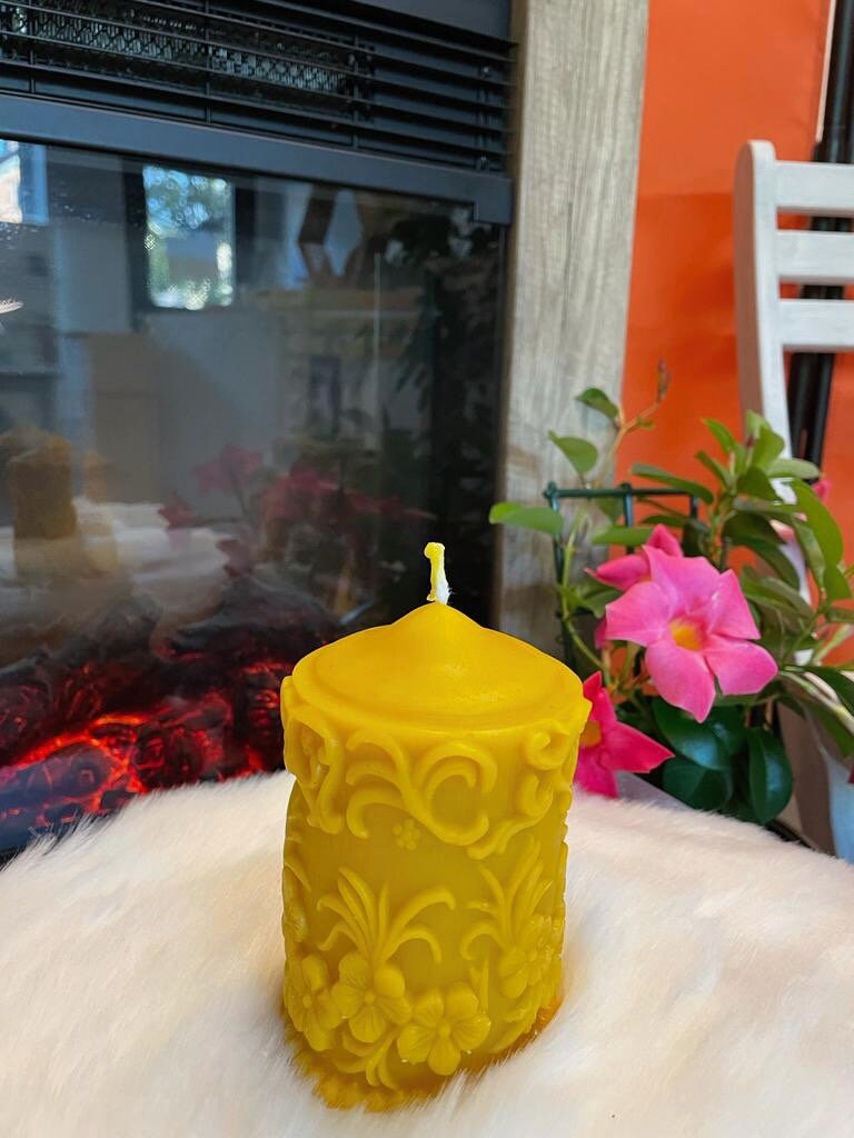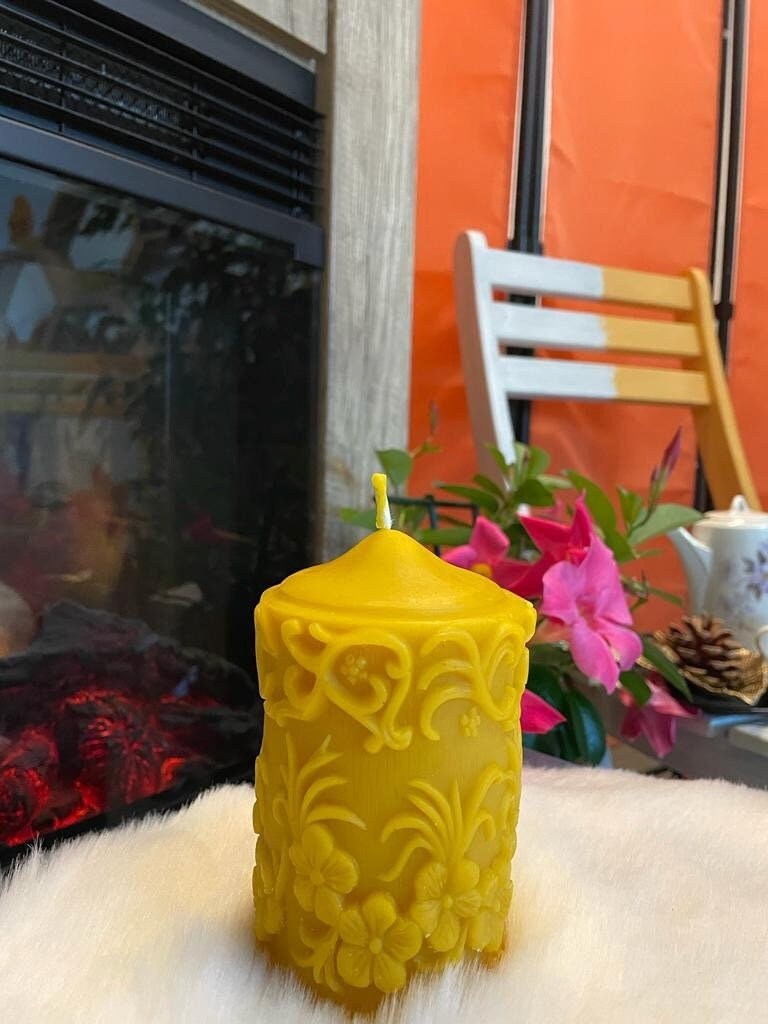 This pillar candle with a beautiful floral pattern convinces with its very long burning time and its beautiful appearance.Height: approx.: 11 cmDiameter: approx.: 6.5 cmWeight: ca: 422g